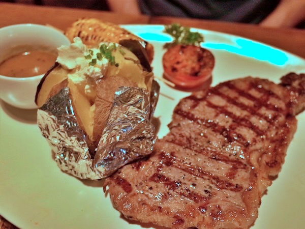 ニュージーランド産のプライム リブ アイステーキには、丸ごと1個のベイクドポテトにサワークリームと、コーンも添えられボリュームも満点です。
