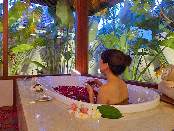 スミニャックのソハム スパの「ユニティ バイ ペボニア」はカップル向けのパッケージで、二人で仲良くゴージャスでロマンチックな花が浮かんだフラワーバスが付いています。