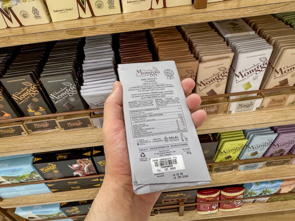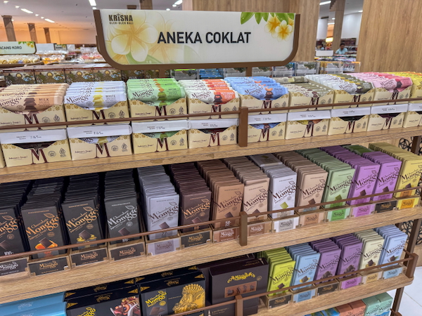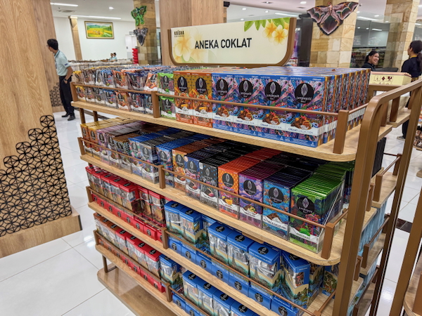 チョコレート、インドネシアで人気のパイ菓子、ナッツ系スナック、コーヒーといった食品から、Tシャツ、バティック柄のバッグ、アクセサリー、ビーチタオル、木彫りの工芸品、サンダル、フォトフレームまで。バリ島の、いわゆる「ばらまき土産」がほぼ全ジャンル1か所に揃っています。