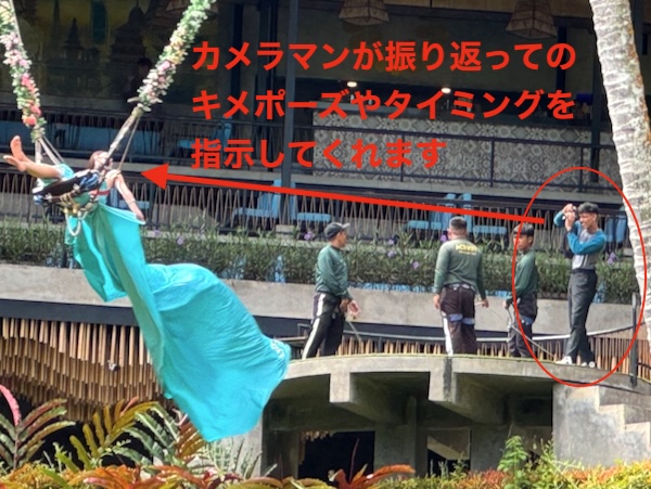 現地で見てると、ブランコは実際かなりの長さなので自分で漕ぐのは不可能(笑)。担当スタッフさんが数名でゲストの背中やブランコを押して動かしてくれ、だいたい15回前後と言う事です。