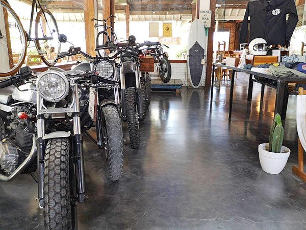デウスはバイクのカスタム屋として有名で、修理工房があり、カスタムメイドのバイクがずらりと並んでおり、バイク好きには垂涎モノ!お隣にはサーフボードのシェイパールームやスケボーリンクもあり、横乗り系が好きな方はたまらんでしょう(笑)。