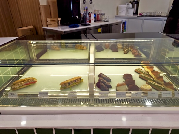 店舗入り口にオープンキッチンとパンやケーキが並ぶショーケースがあり、テイクアウトで買い物をする人が多く見られます。