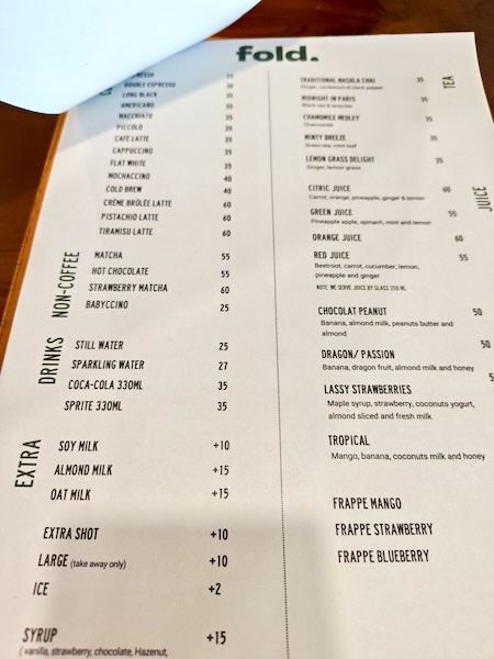 フォールドは、他にもクラシックブレックファースト、バナナパンケーキ、ヨーグルト&フルーツと言った朝食メニューから、シーザーサラダ、ニースサラダ、ボロネーゼパスタ、カルボナーラ、フィッシュ&チップス、ポークベリー、和牛ステーキと言った、ランチやディナーになるしっかりした食事メニューが揃っているので、アイコンバリ内でお腹が空いた時に使えるカフェです。
