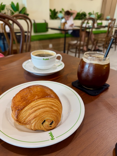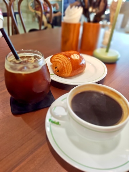私はロングブラックコーヒー(35,000ルピア)、マーニはアイスコーヒー(37,000ルピア)とパンオショコラ(27,000ルピア)を注文しました。