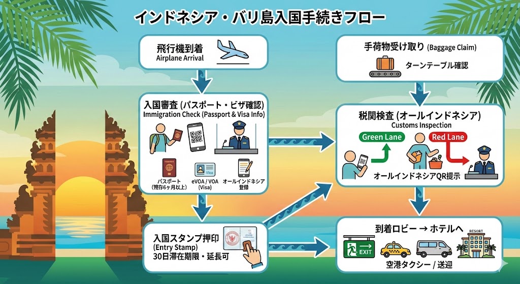 インドネシアの中でも、バリ島(デンパサール国際空港)は日本人旅行者が最も多く利用する入国地点です。ここでは空港到着から入国完了までの具体的な流れと、バリ島特有の注意点を解説します。