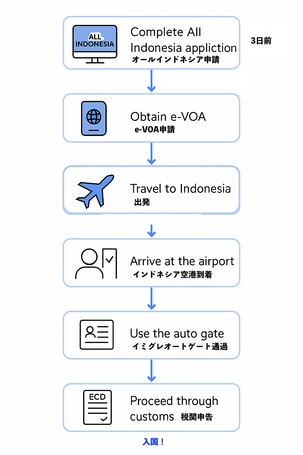 - インドネシア到着日を含む3日(72時間)前になったら、公式サイト「オール インドネシア (All Indonesia)」にアクセス(https://allindonesia.imigrasi.go.id)してWeb版で入力する。またはAll IndonesiaのiOS/Android専用アプリから入力する。出発前日に完了が目安。