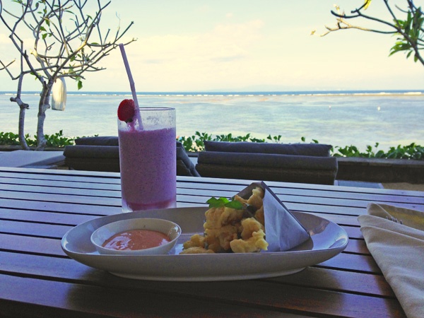 海風が強い時で、少し寒かったけど、カラマリ(イカフライ)とストロベリージュースで、のんびり海を楽しむことができました。