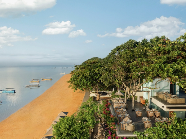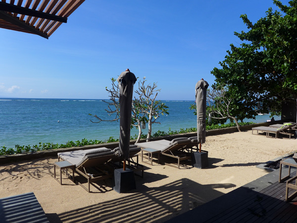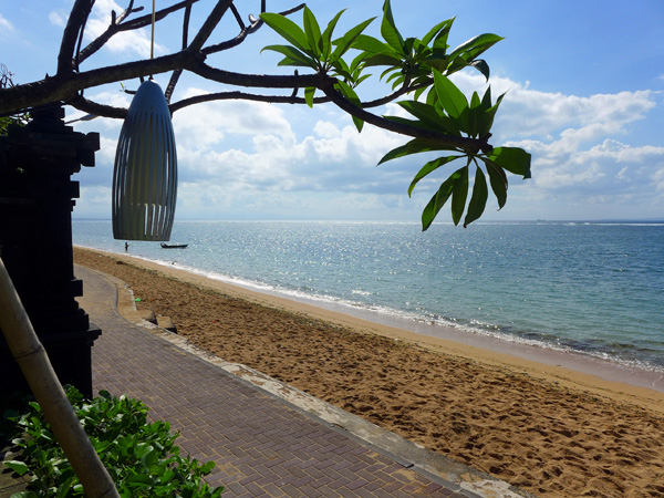 サヌールビーチには、オーシャンビューのホテル、レストラン、カフェがありますが、多くがビーチを貫く遊歩道に面しているため、どうしても歩行者や自転車が視界に入ってきてしまいます。