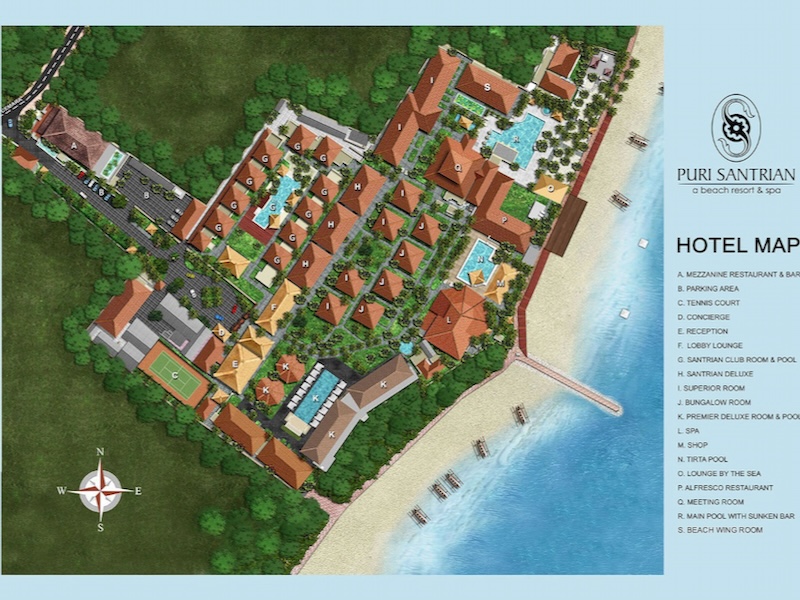サヌールに古くからあるプリ サントリアン ホテルは、ビーチに面した開口部、いわゆるプライベートビーチが200mもある、非常に大きなホテルで、敷地はサントリアンクラブ、プレミアデラックス、バンガロー等、各カテゴリーごとに緩くエリア分けされています。