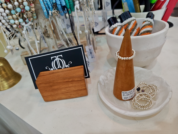 今回私は入荷したばかりと、スタッフに教えてもらったシルバーのビーズを使った細いリングを買いました。指輪はシリコンゴム製なので、サイズもフレキシブルで、1つ、180,000ルピアと2,000円弱でリーズナブルなのも嬉しい。