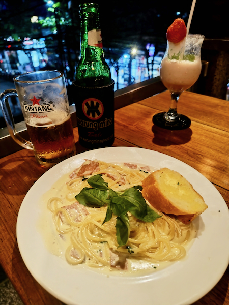 食事は、ナシゴレン(49,000ルピア)、チャプチャイ(49,000ルピア)、カルボナーラ(63,000ルピア)をオーダーしました。