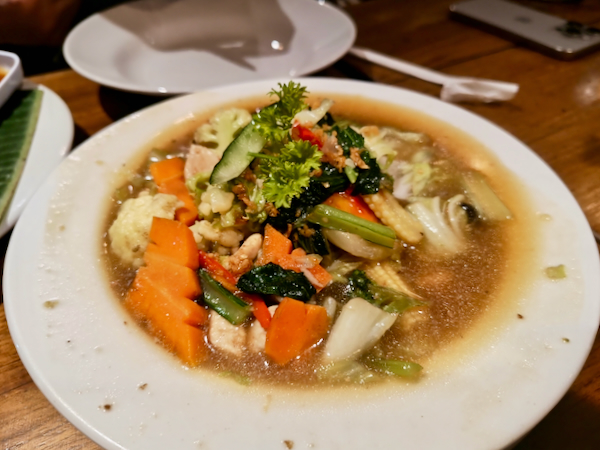 汁だくのチャプチャイは、あっさり系の味付けでニンジン、ブロッコリー、カリフラワー等の野菜がたっぷり食べられ、ナシゴレンにかけて食べても美味しいです。